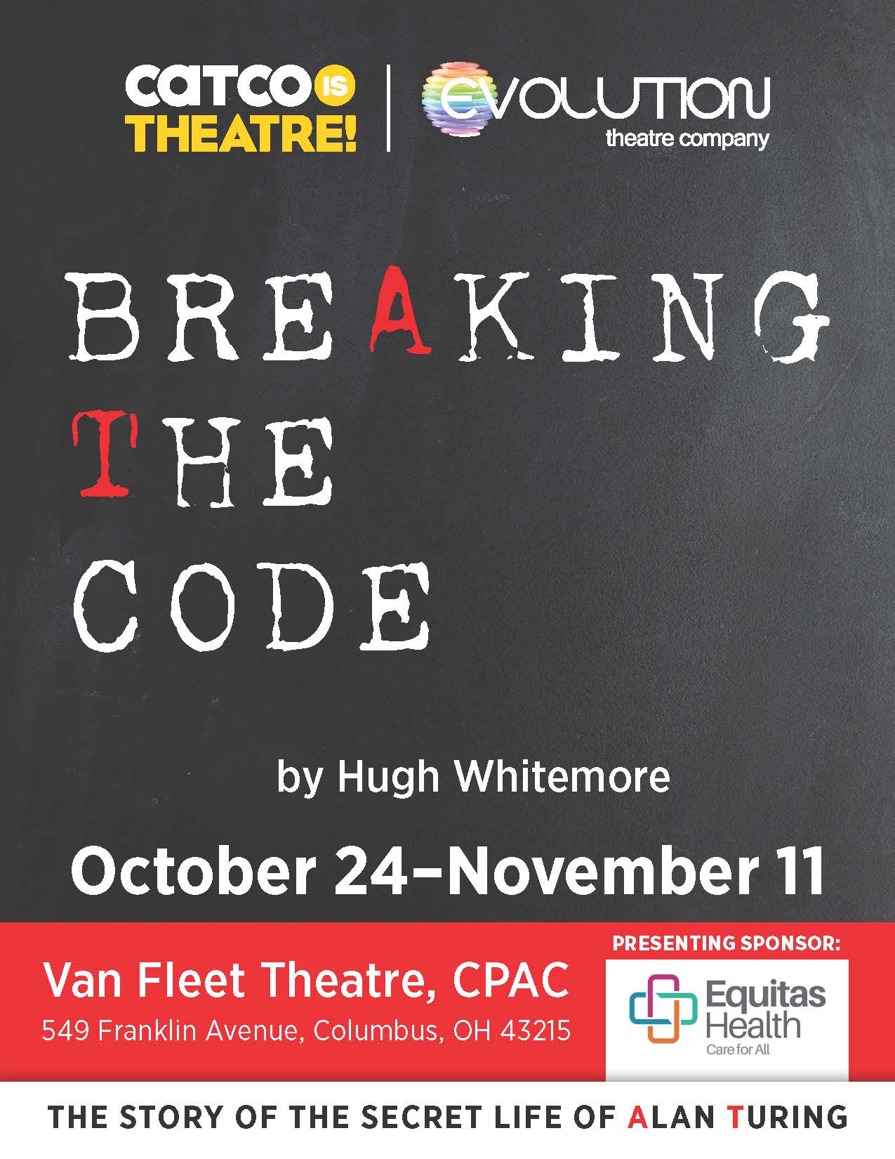 BREAKING THE CODE Previews Oct. 24 @ 11:00 AM & Oct. 25 @ 7:30 Performances Oct. 26, 27, Nov. 2, 3, 9 & 10 @ 8:00; Oct. 31, Nov. 1, 7 & 8 @ 7:30; Oct. 28, Nov. 4 & 11 @ 2:00. An exceptional biographical drama about a man who broke too many codes: the eccentric genius Alan Turing, who played a major role in winning World War II. He broke the complex German code called Enigma, enabling allied forces to foresee German maneuvers. Since his work was classified top secret for years after the war, no one knew how much was owed to him when he was put on trial for breaking another code: the taboo of homosexuality. Turing, who was also the first to conceive of computers, was convicted of the criminal act of homosexuality and sentenced to undergo hormone treatments which left him physically and mentally debilitated. He died by suicide, forgotten and alone. This play is about who he was,